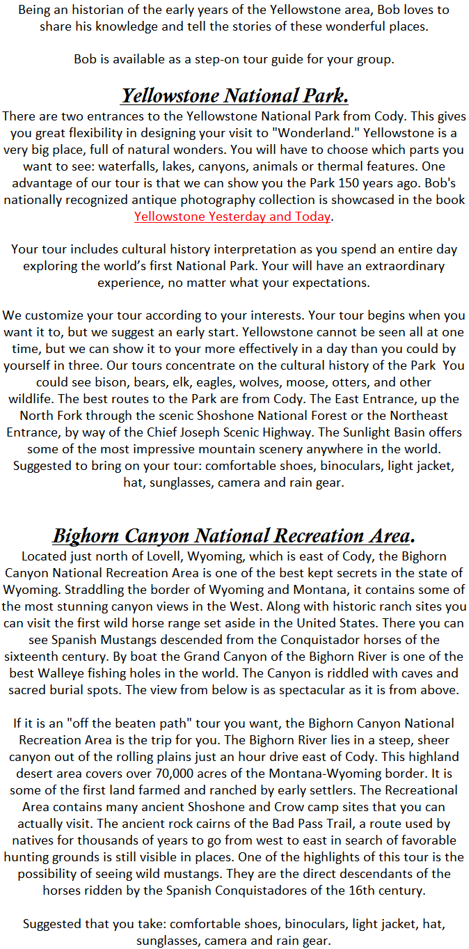 Want someone else to do the driving? Contact Cody Shuttle Tours and request Bob as your Guide! 307-527-6789