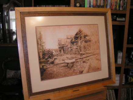This image is available in various sizes, alone, matted, or framed in wood from the historic Old Faithful Inn floor which was taken up by Bob Berry, Jr in October 2004 during the first phase of the renovation. Please call for details. The Old Faithful Inn under construction in an Old Faithful Inn lobby wood frame is the best gift you can give to a "Yellowstoner."